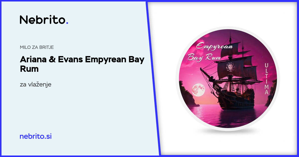 Ariana & Evans Empyrean Bay Rum je kremasto milo za britje blagovne znamke iz ZDA. Gre za nenavadno interpretacijo tradicionalne moške dišave Bay Rum — brez olj nageljnovih žbic in cimeta, ki lahko pri občutljivi koži povzročita draženje ali alergijske reakcije. Osnova Ultima — z živalskimi maščobami, emu oljem in rastlinskimi olji, ki zagotavljajo spolzko in bujno peno.