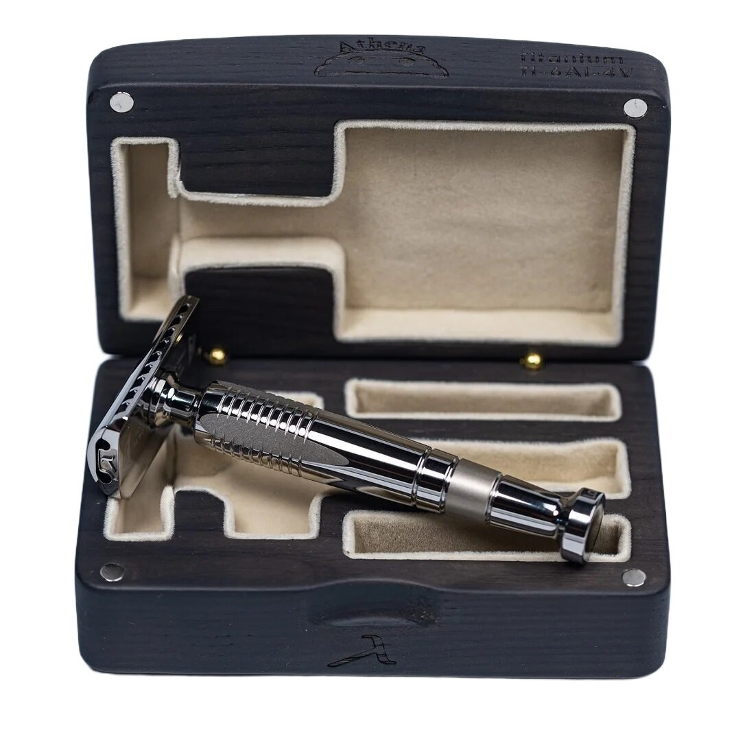 Brivnik Lambda Athena Titanium bo do lastnika prišel v razkošnem kovčku iz lesa mandžurskega jesena (Tamo), močnega, prožnega in teksturiranega materiala. Na zgornjem pokrovu škatle je logotip blagovne znamke.