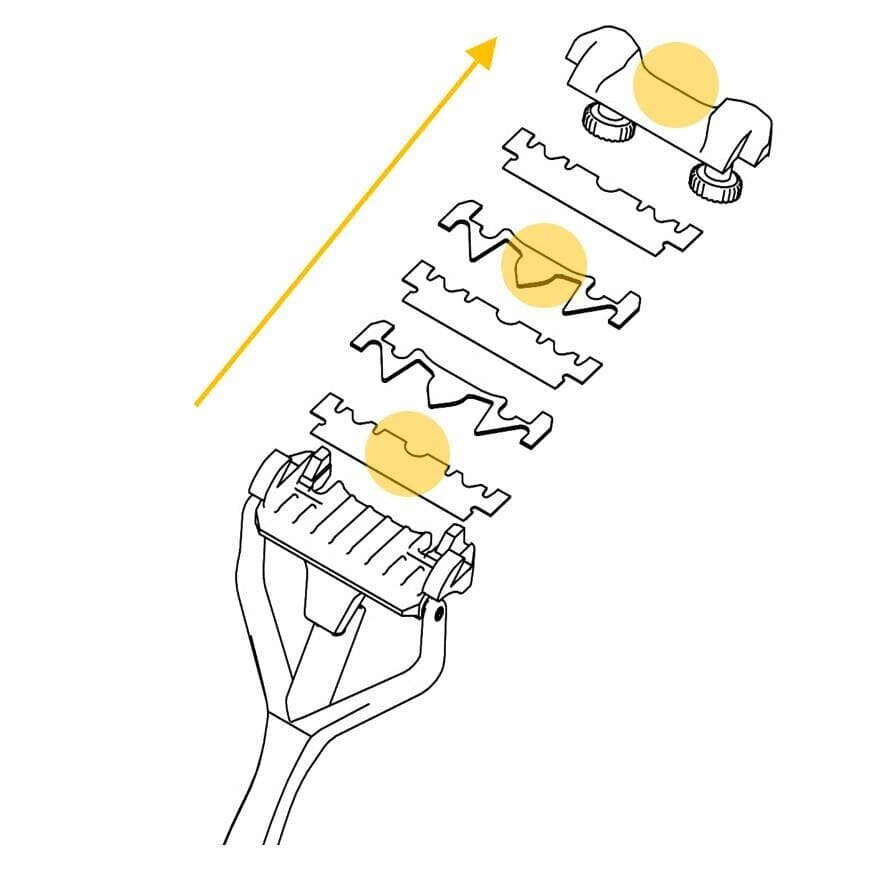 Brivnik je že opremljen s 3 rezili Derby, enako število rezil je vključeno v komplet. Nato lahko uporabite katera koli single edge ali običajna double edge rezila, tako da jih na sredini navpično prelomite.